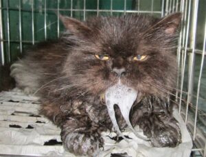 - Chảy nhiều nước mắt, mèo bị sụp mí mắt, đôi mắt lờ đờ, thiếu sức sống, xuất hiện mí mắt thứ ba ở nơi hốc mắt, trũng và mũi miệng thâm đen.